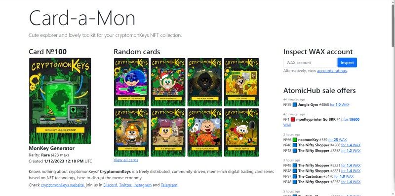Useful site for collectors of cryptomonKeys WAX NFT cards. WAX blockchain integration, AtomicHub marketplace integration, owner & card statistics, Telegram bot for low-price and missed-cards sale alerts and more.